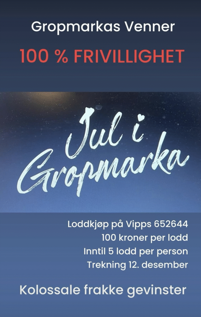 Nå kommer Julelotteriet i Gropmarkas Venner for tredje gang. «Dekk driv nå med mye rart, sa en her en dag?» JA, og sannheten er at de kronene er kjærkomne for drifta vår (2024: 29.300) som er 100% tuftet på frivillighet. Read More